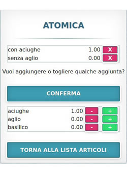 combinazione delle categorie, per esempio "Pizza Bismark" "senza uovo" "senza prosciutto""con acciughe" "ben cotta".
